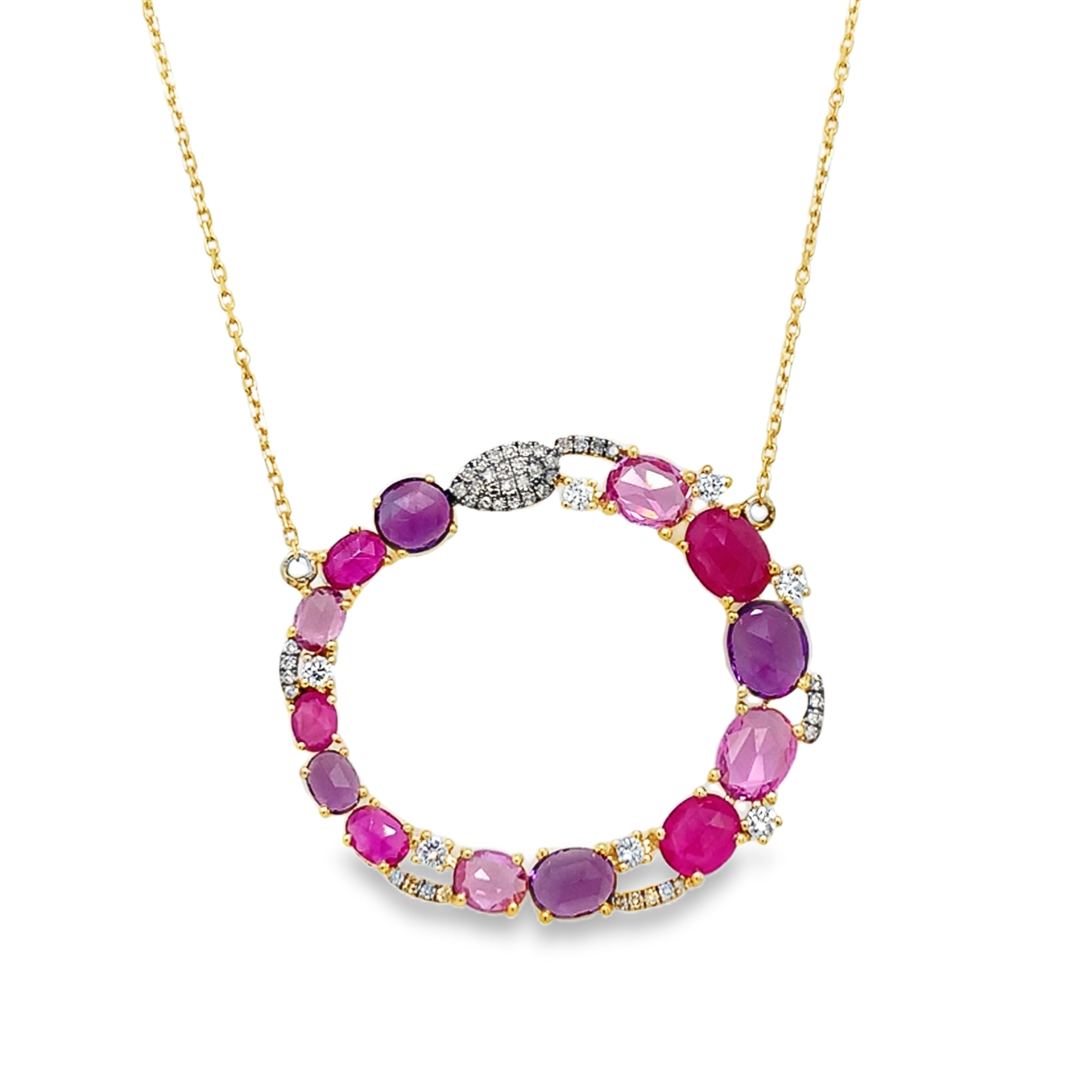 Elevate your elegance with our 14KY Colored Stone and Diamond Necklace, a masterpiece of vibrant luxury. This exquisite necklace features a stunning circle pendant adorned with a captivating array of colored stones, including rich purples and vivid pinks, each meticulously set in 14-karat yellow gold. Accentuated by sparkling diamonds, this piece radiates brilliance and sophistication. Perfect for special occasions or adding a touch of glamour to your everyday attire, this necklace is a versatile addition to any jewelry collection. Its delicate gold chain complements the pendant's vivid hues, ensuring it stands out beautifully against any ensemble. Indulge in timeless elegance and make a statement with every wear.
